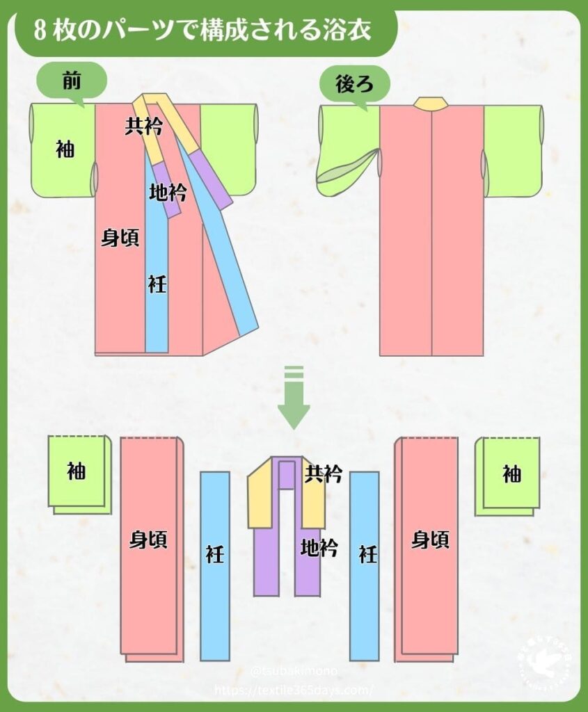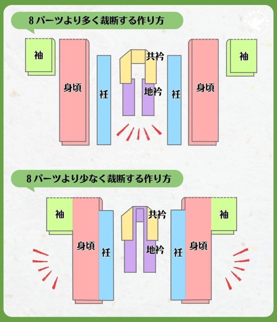 一般的な仕立てでは、身頃・袖・衽・地衿・共衿の合計8枚のパーツで構成されます。