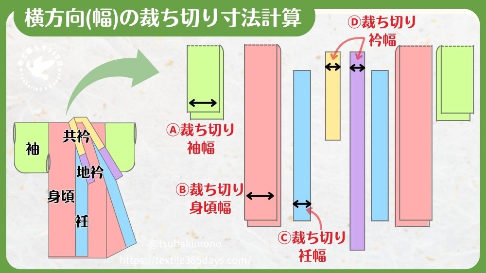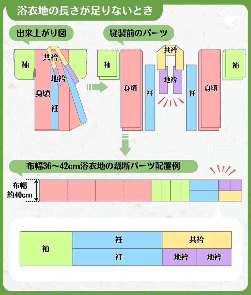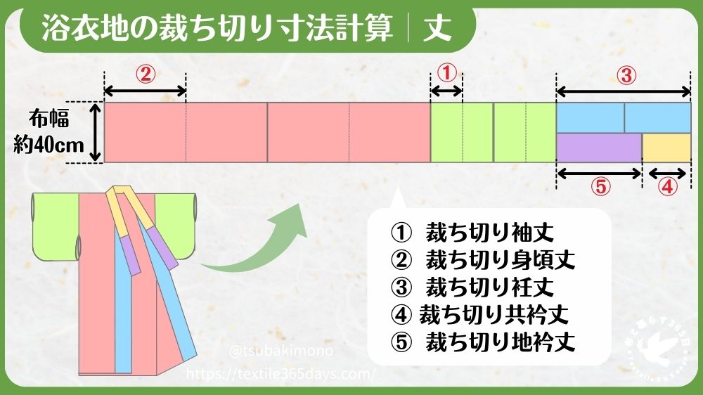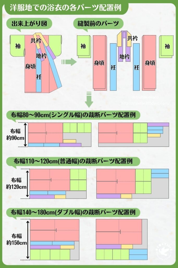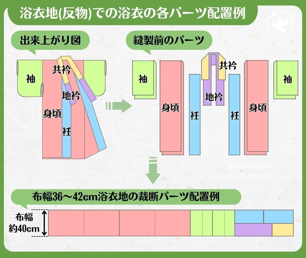 浴衣地で浴衣を作る場合、用いる浴衣地の布幅で裄(袖幅+肩幅)が足りるなら、その他パーツの幅の計算は基本的に不要です。