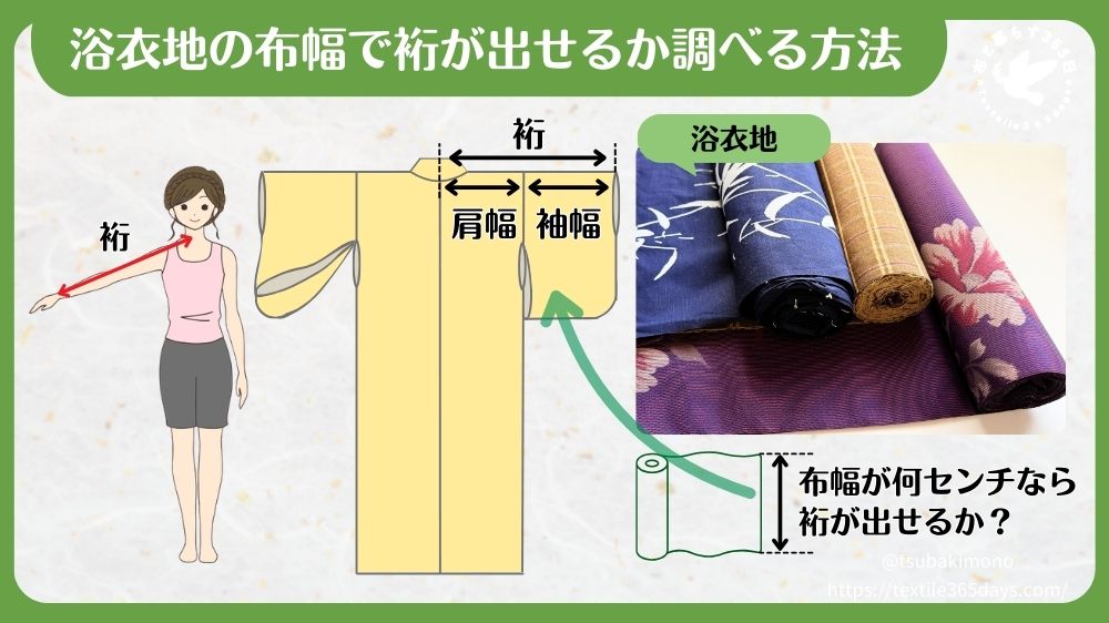 用いる浴衣地(反物)の布幅で、裄が足りるかどうか調べる方法があります。
