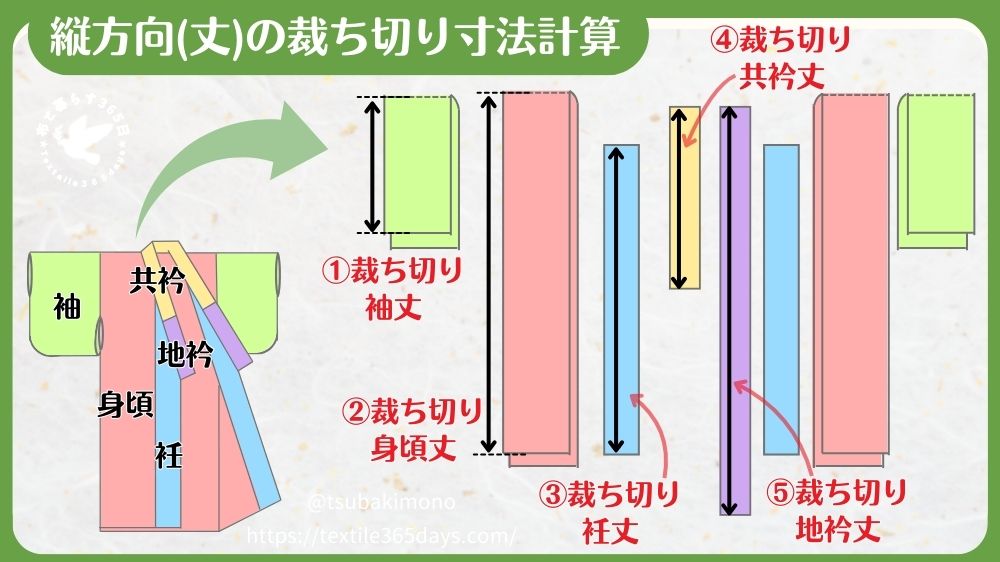 肩から裾への方向を縦方向(丈)とします。縦方向の裁ち切り寸法の計算方法は以下です。