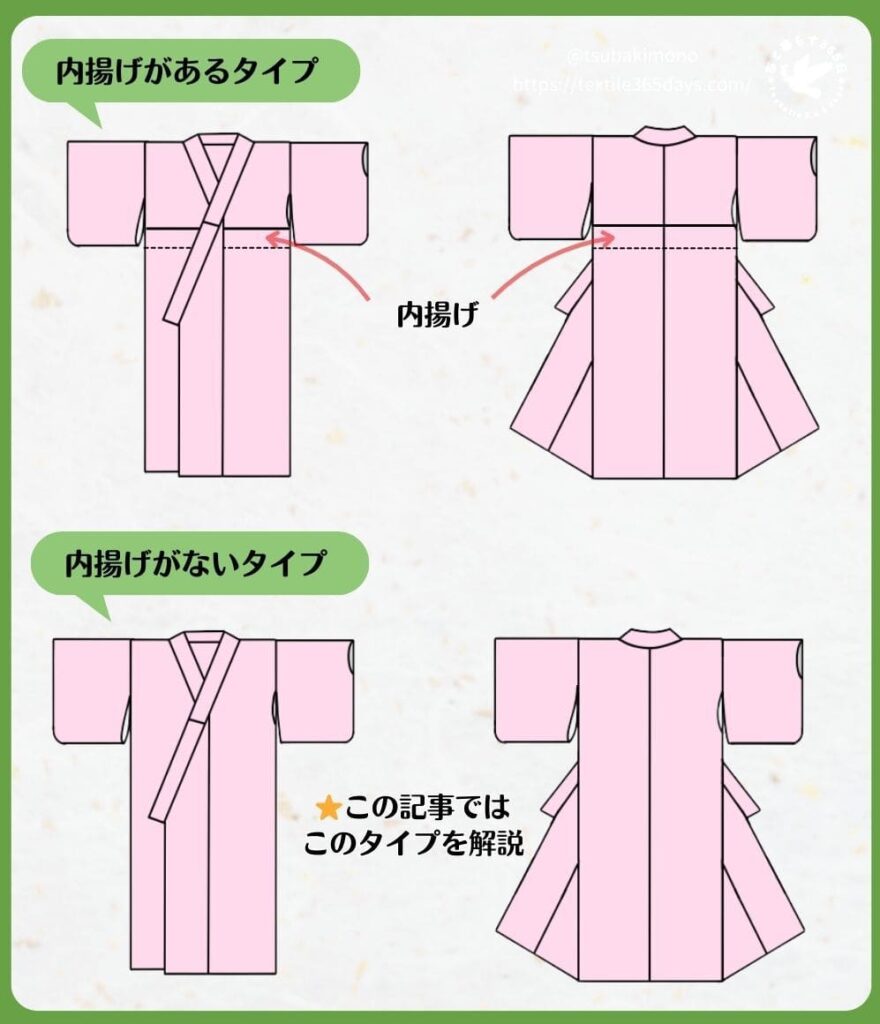 | 揚げがある浴衣を作るのがおすすめの人 | ・サイズ直ししやすい浴衣を作りたい ・本格的な和裁仕様にしたい ▶揚げがある浴衣の作り方ページへ(近日公開予定) |