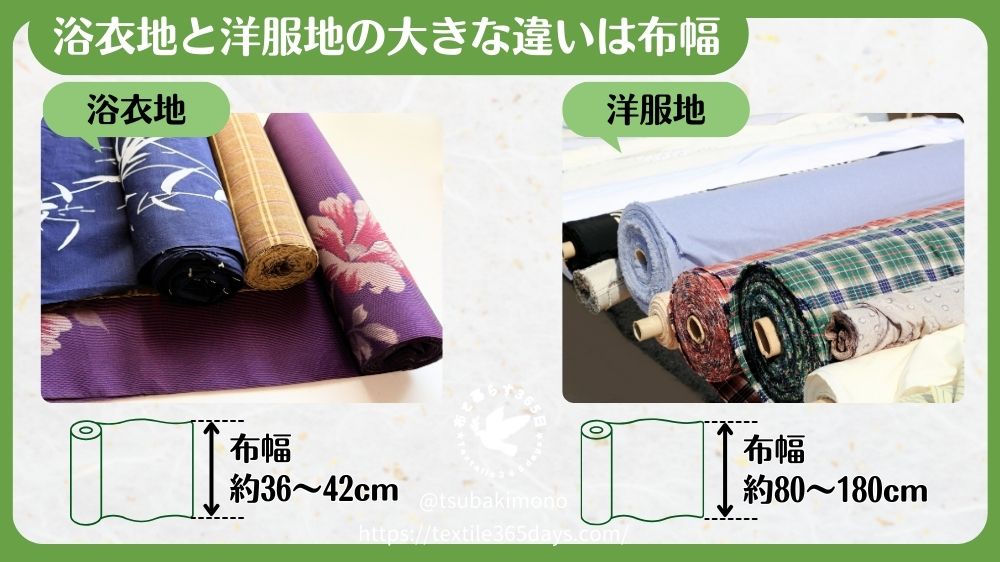 浴衣地は布幅が約36~42cmの反物です。それに対して、洋服地は80~180cmと様々な布幅があります。