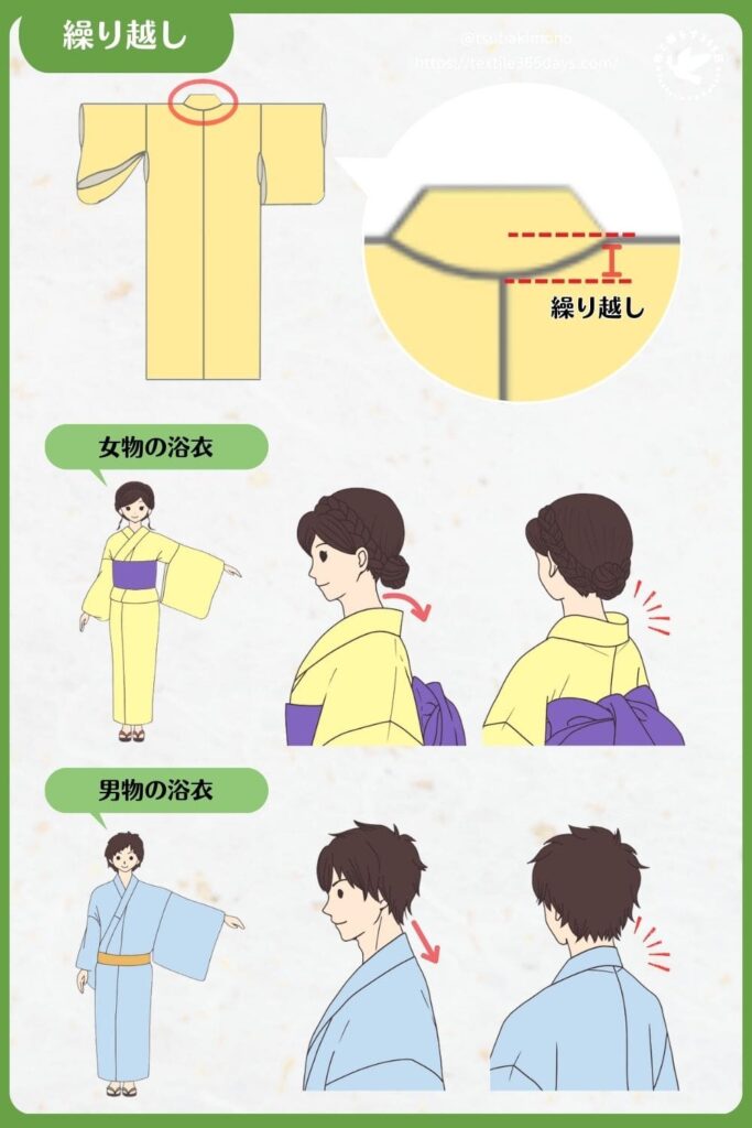 繰り越しとは、衿を付ける位置を肩山より背中側に下げて付ける長さで、衿を後ろに下げて(衣紋を抜いて)着るために設けられた、女性用の浴衣・着物特有の寸法です。