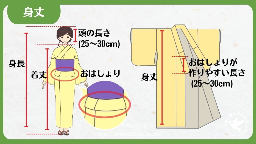 おはしょりを綺麗に出しやすい「おはしょり分の長さ」と「頭の長さ」は、どちらも25〜30cmほどなので、身丈は身長と同じ長さになります。