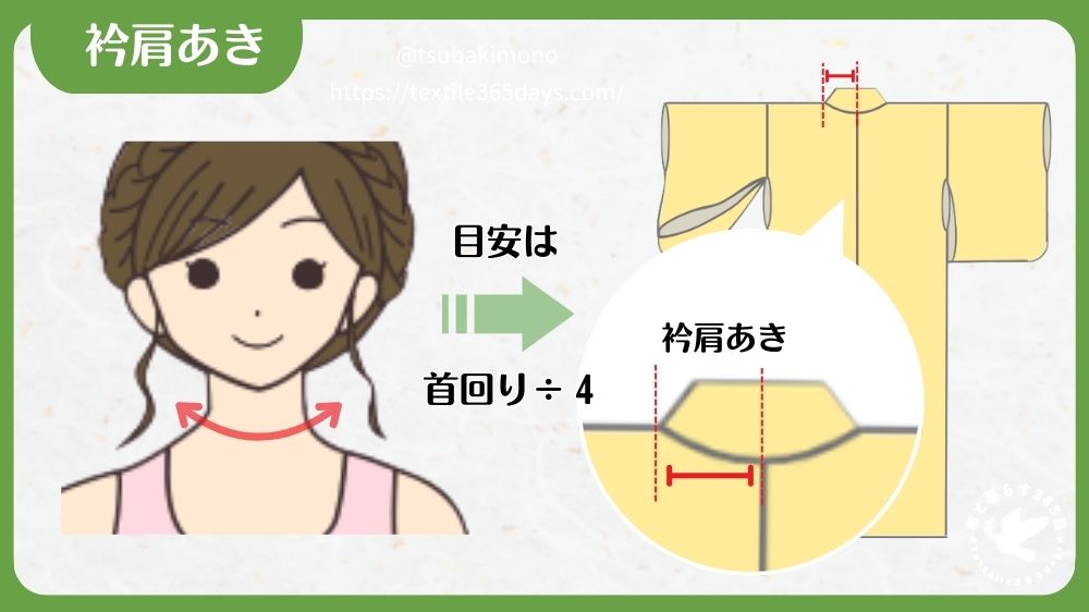 衿肩あきは首回りの4分の1を目安にしますが、着方によって自由に調整できるため、標準寸法で問題ありません。
