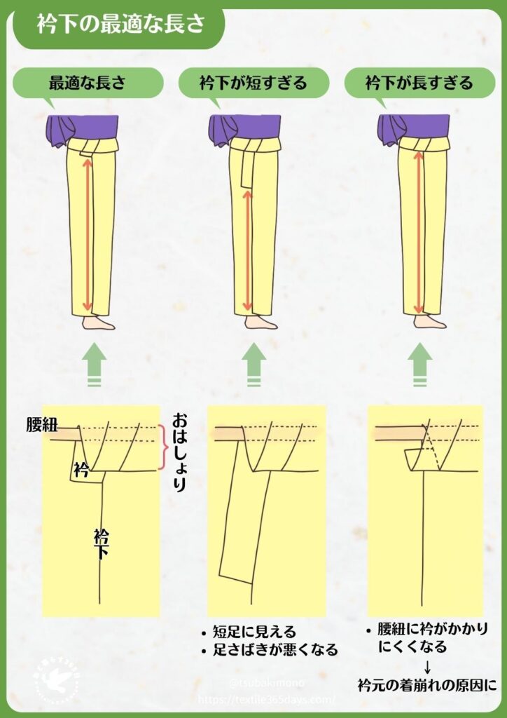 衿下が短すぎると衿先がおはしょりの下から出てしまい、着姿が崩れます。反対に長すぎると衿が腰ひもにかかりにくく、衿元が落ち着かなくなります。つまり、衿下は“短すぎず長すぎず”が最適です。