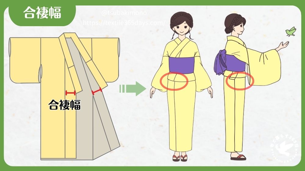 合褄幅とは、衿先位置から前身頃と衽の縫い目までの衽の横幅のことです。