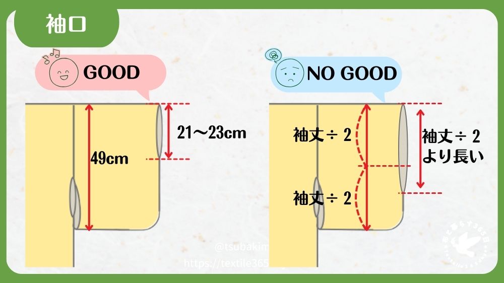 衽下がりは肩山から剣先までの長さで、21~23cmの範囲内で体型や着方の好みに合わせて決めます。